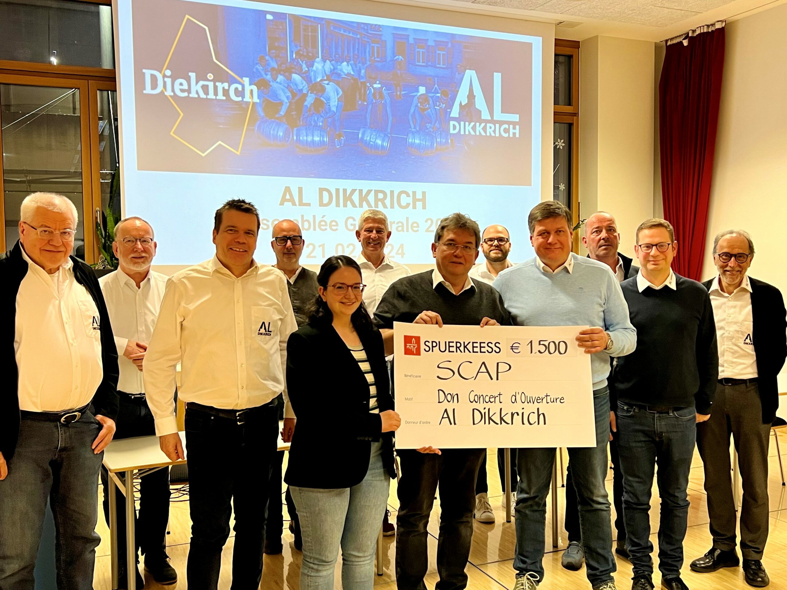 Der Erlös von 1500.- des « concert d’Ouverture » des „Al Dikkrich“ Festes in der alten Diekircher Kirche am 13. Juli 2023 wurde dem LAP/SCAP in der Generalversammlung in Diekirch am 21. Februar 2024 im Beisein von Lisi WALLERS; Ergotherapeutin des SCAP, überreicht. Wir können damit das Projekt „mäi Wee an de SCAP“ mitfinanzieren. Familien ohne die nötigen finanziellen Mittel wird die An- und Abfahrt in die Therapie in den SCAP finanziert. Wir bedanken uns sehr herzlich für die Unterstützung!